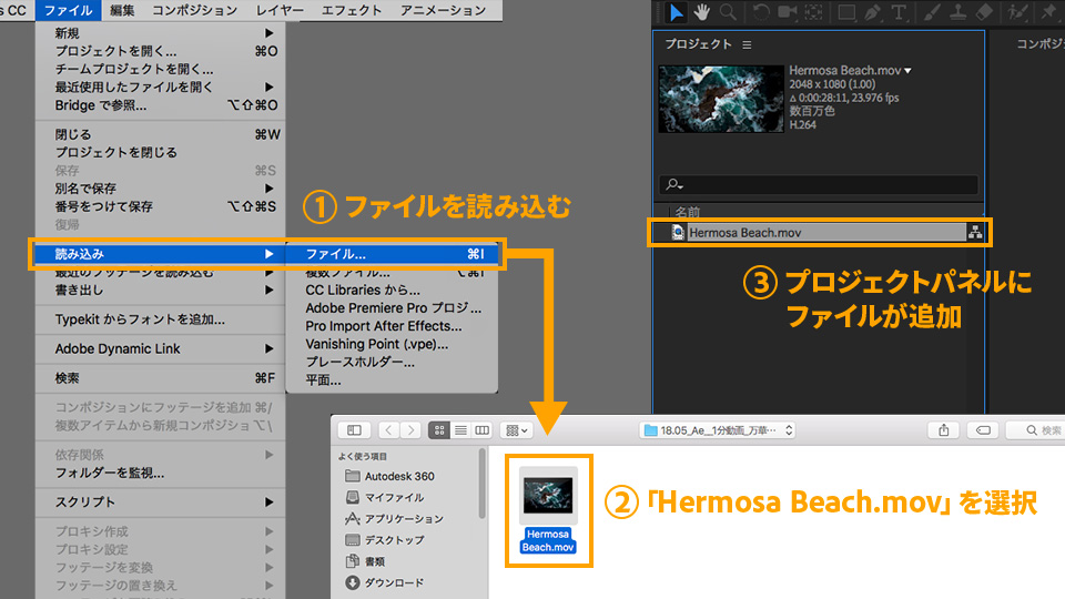 「ファイル」→「読み込み」→「ファイル」から、ダウンロードした練習用サンプルファイル「Hermosa Beach.mov」を選択して「開く」をクリックします。プロジェクトパネルにファイルが追加されます。