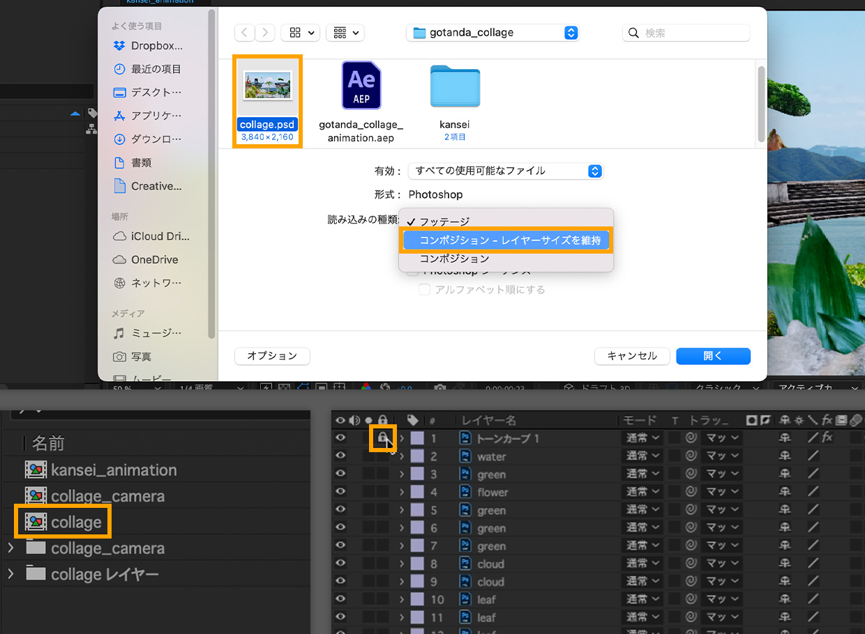 コラージュ素材をAfter Effectsに読み込むために、ファイル>読み込み>ファイル を選択して、「collage.psd」をクリックします。ファイルの読み込みの種類を「コンポジション-レイヤーサイズを維持」にして読み込み、OKを押します。プロジェクトパネルの「collage」をダブルクリック。レイヤーの一番上にある「トーンカーブ1」をロックします。ロックすることで、画面上で他のレイヤーを自由に移動できます。