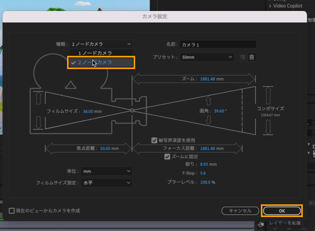 3Dレイヤーの変更が完了したら、レイヤー>新規>カメラ を選択します。種類を「2ノードカメラ」にしてOKをクリックします。