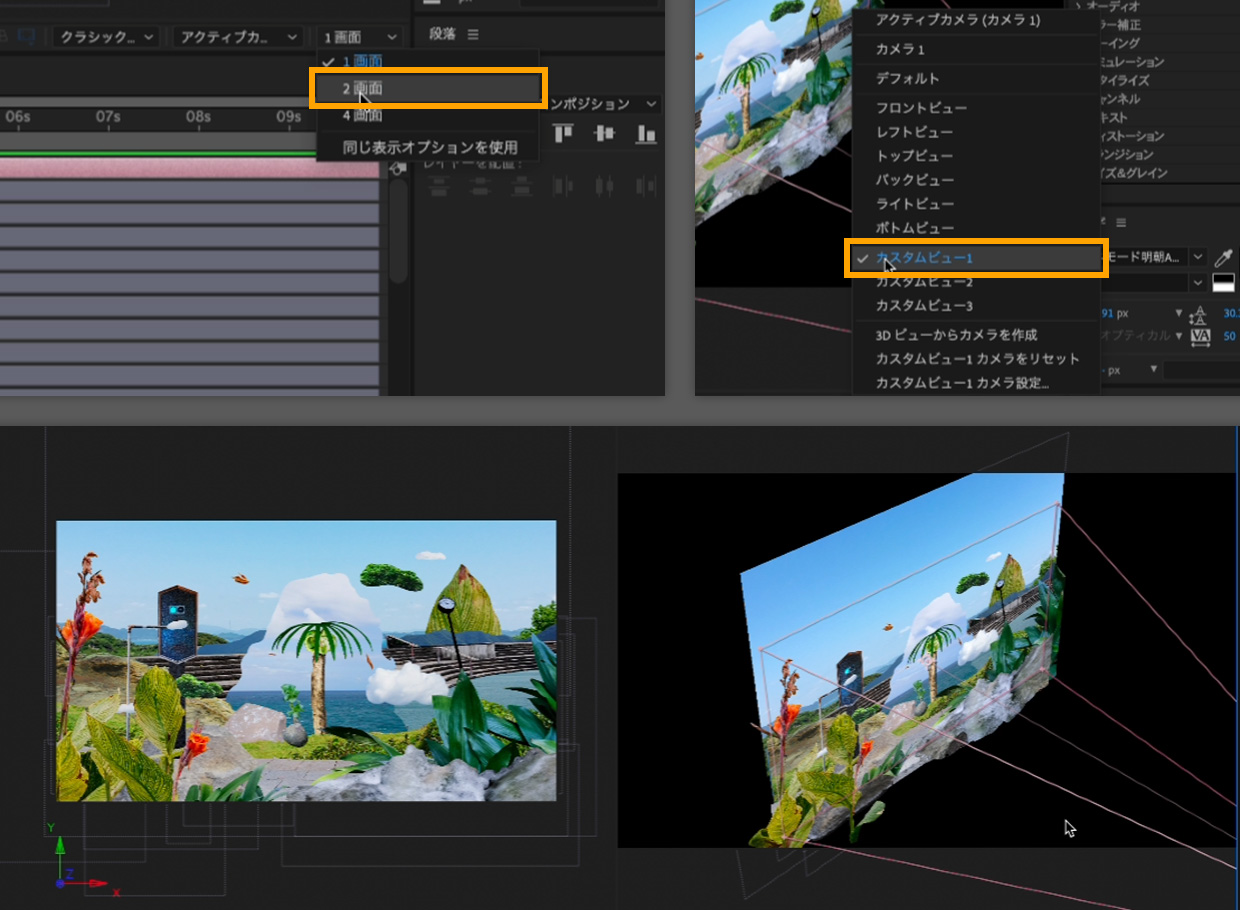 コンポジションパネルの「ビューのレイアウト」を「2画面」に変更します。また、「3Dビュー」を「カスタムビュー1」にすることでレイヤーの奥行きがわかりやすくなります。