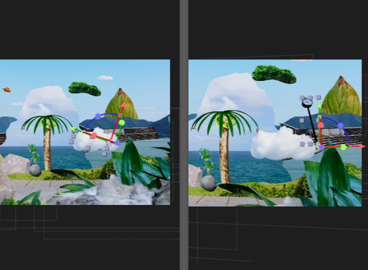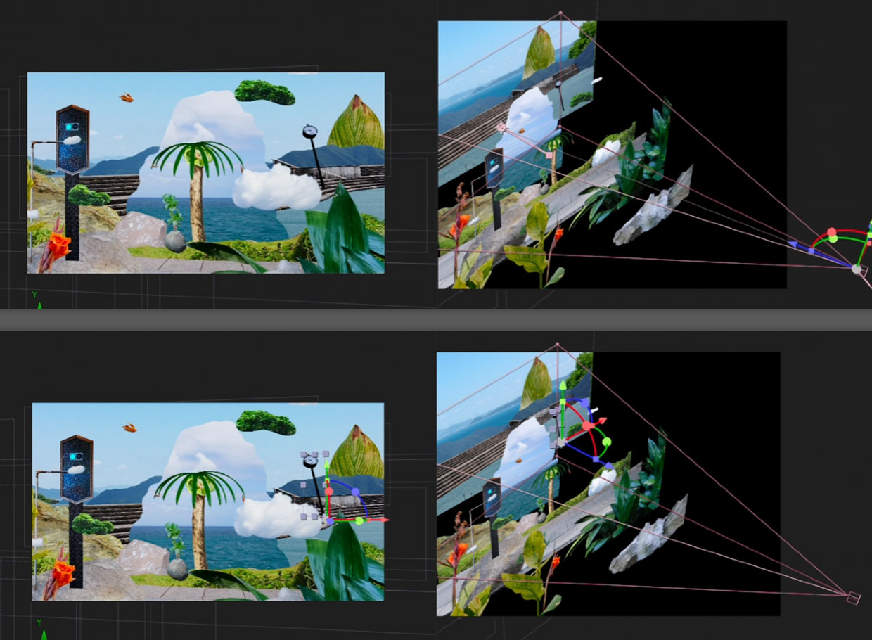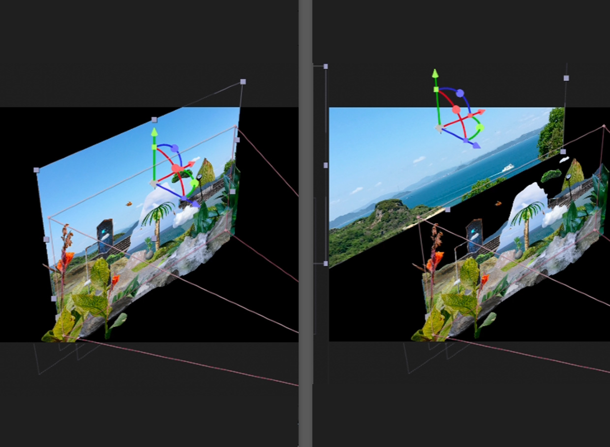 遠くにあるオブジェクトほどカメラから離すようにオブジェクトを移動させます。例としてレイヤー29「sky」を移動してみます。トランスフォーム>位置を[1932,70,2000]に、スケールを[160%]に変更します。すでに全てのレイヤーの奥行きを調整してあるコンポジション「collage_camera」を開きます。