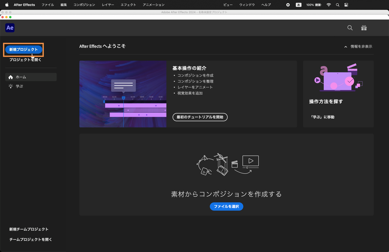 After Effectsを起動し、スタート画面の「新規プロジェクト」を選択。