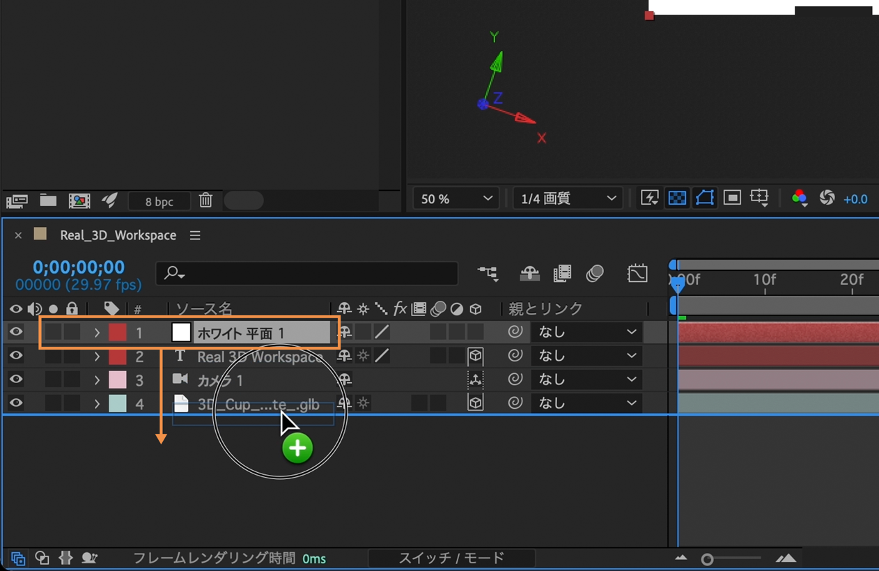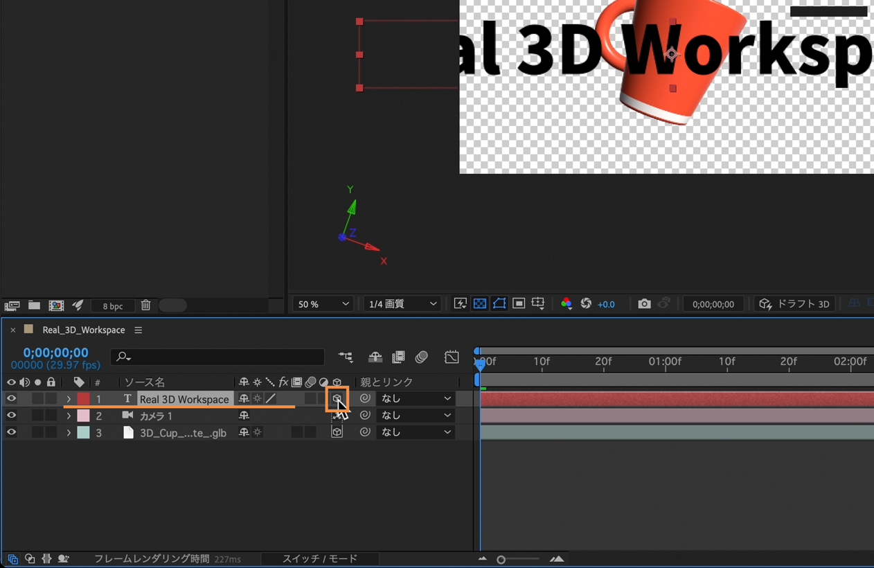 タイムライン上で「T:Real 3D Workspace」を選択し、3Dレイヤーのチェックボックスにチェックを入れます。