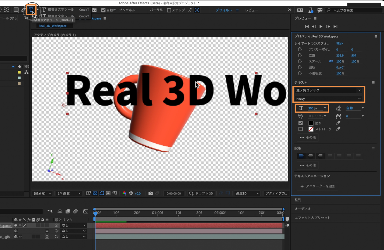 ツールバーの中から「横書き文字ツール」を選択して、コンポジションパネル上に文字を入力。(今回は「Real 3D Workspace」というテキストを全て半角英数字で入力します)