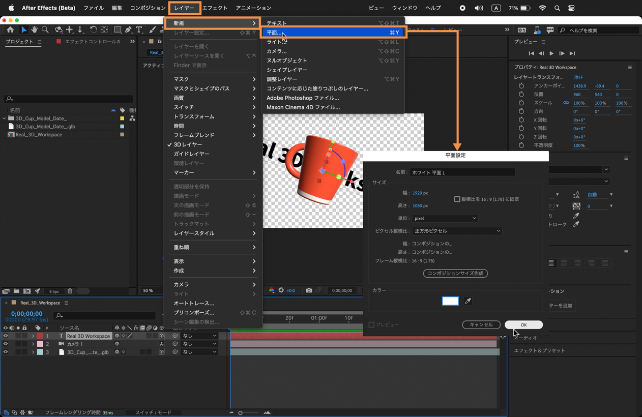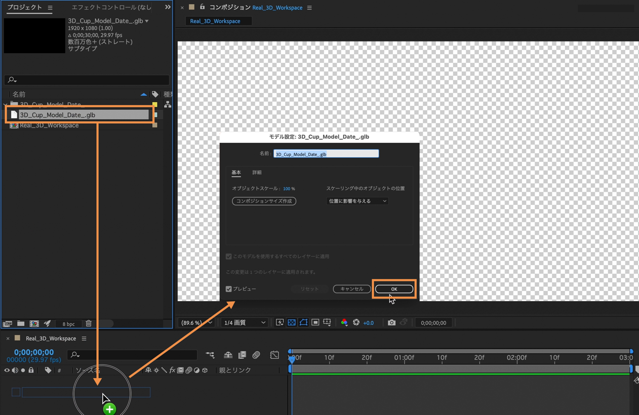 プロジェクトパネル上の、該当素材(3D_Cup_Model_.glb)をタイムラインパネルへドラッグ&ドロップします。[モデル設定:3D_Cup_Model_.glb]のポップアップで「OK」を選択。