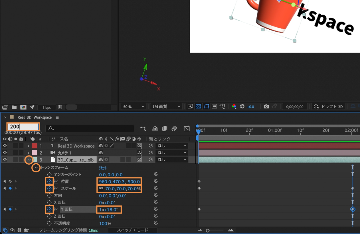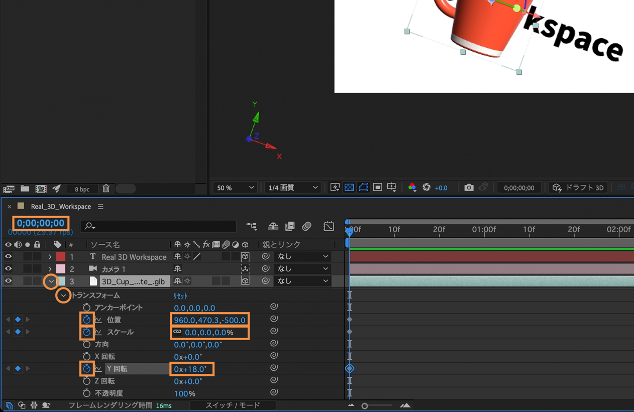 タイムラインパネル上の「3D_Cup_Model_.glb」の横にある>マークを開き、更に「トランスフォーム」の横にある>マークも開きます。