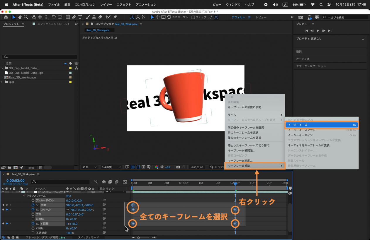 タイムラインパネル上で、追加した4つのキーフレームを全て選択し、キーフレームの点の上で右クリックから「キーフレーム補正」→「イージーイーズ」を適用。