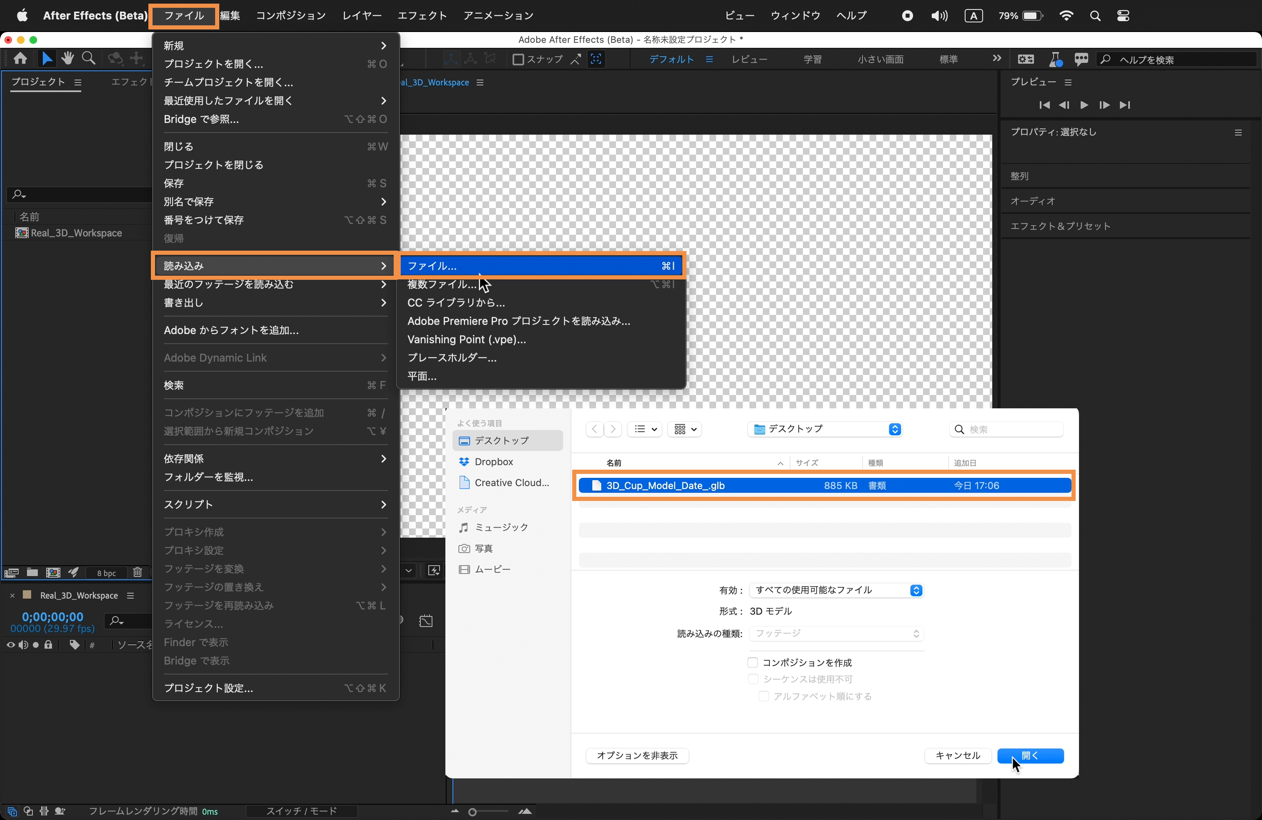 メニューバーの「ファイル」のプルダウンから「読み込み」→「ファイル」を選択。パソコン内に保存したダウンロード素材(3D_Cup_Model_.glb)を選択して「開く」をクリックして、素材を取り込みます。