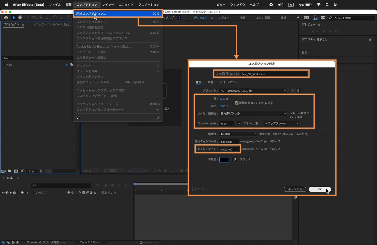 コンポジション設定パネルの各項目を下記の図のように設定します。