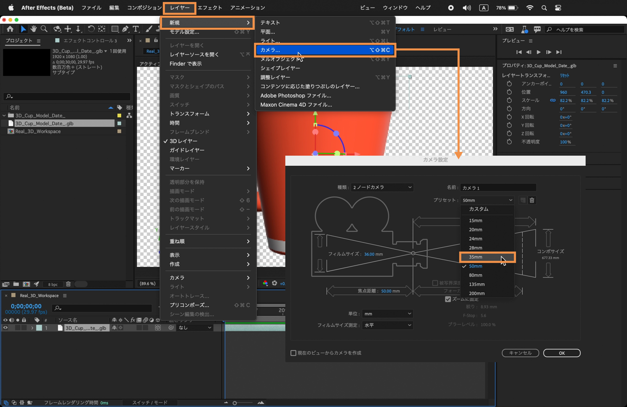 メニューバーの「レイヤー」から「新規」→「カメラ」を選択。カメラ設定の項目からプリセット:35mmを選んで「OK」を選択。