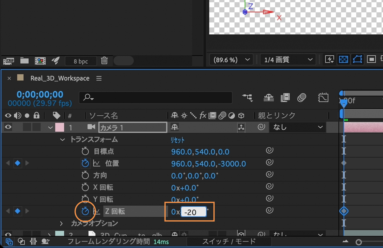 続いて、「Z 回転」の横のストップウォッチにチェックを入れてキーフレームを追加します。