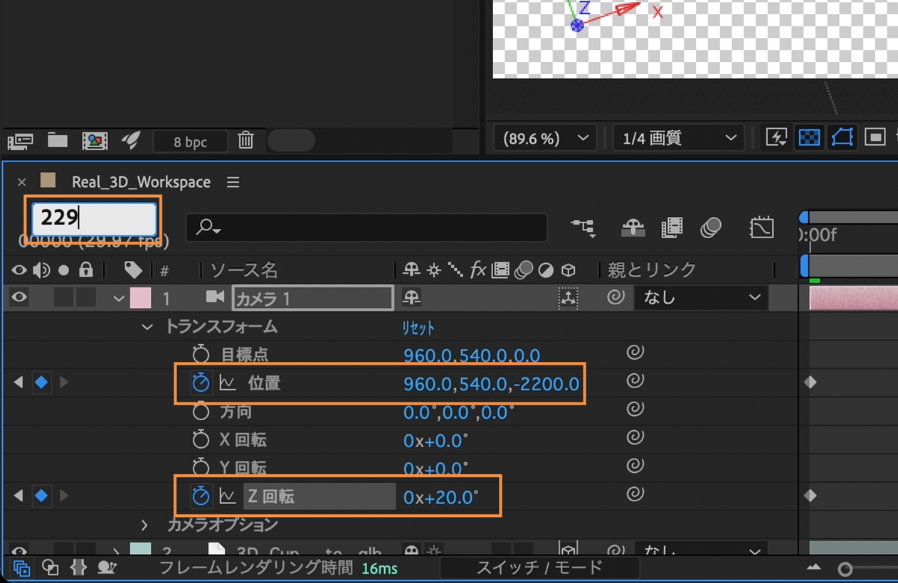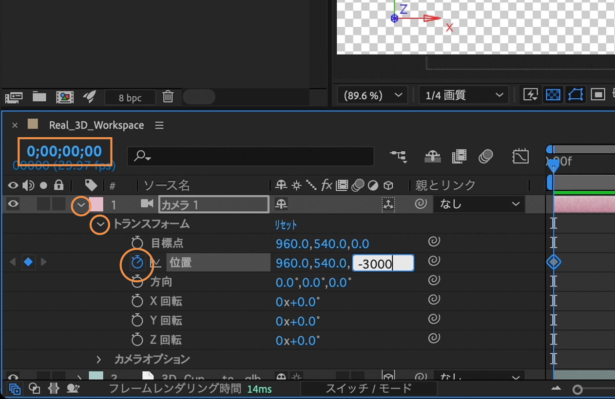 タイムラインパネル上に作成された「カメラ 1」の横にある>マークを開き、更に「トランスフォーム」の横にある>マークも開きます。