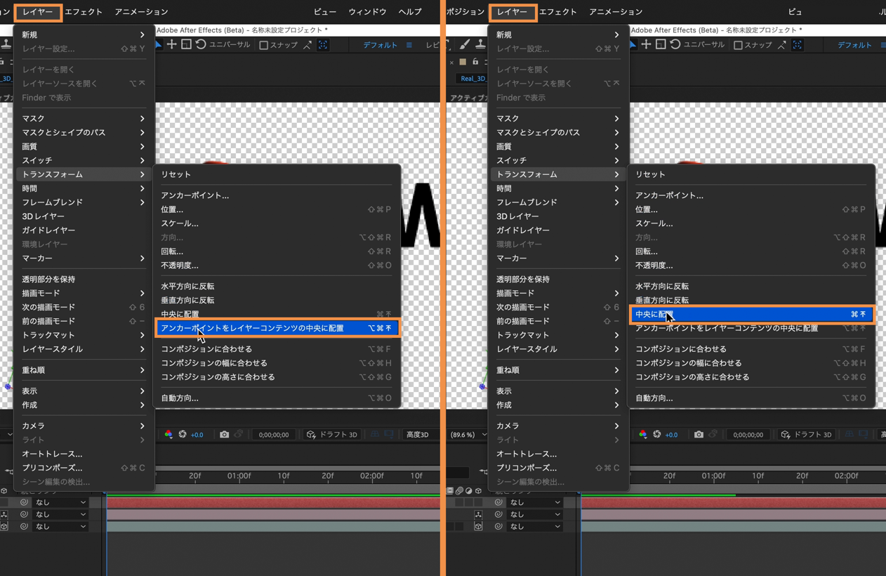 メニューバーの「レイヤー」のプルダウンから「トランスフォーム」→「アンカーポイントをレイヤーコンテンツの中央に配置」を選択。さらに、「トランスフォーム」→「中央に配置」を選択。