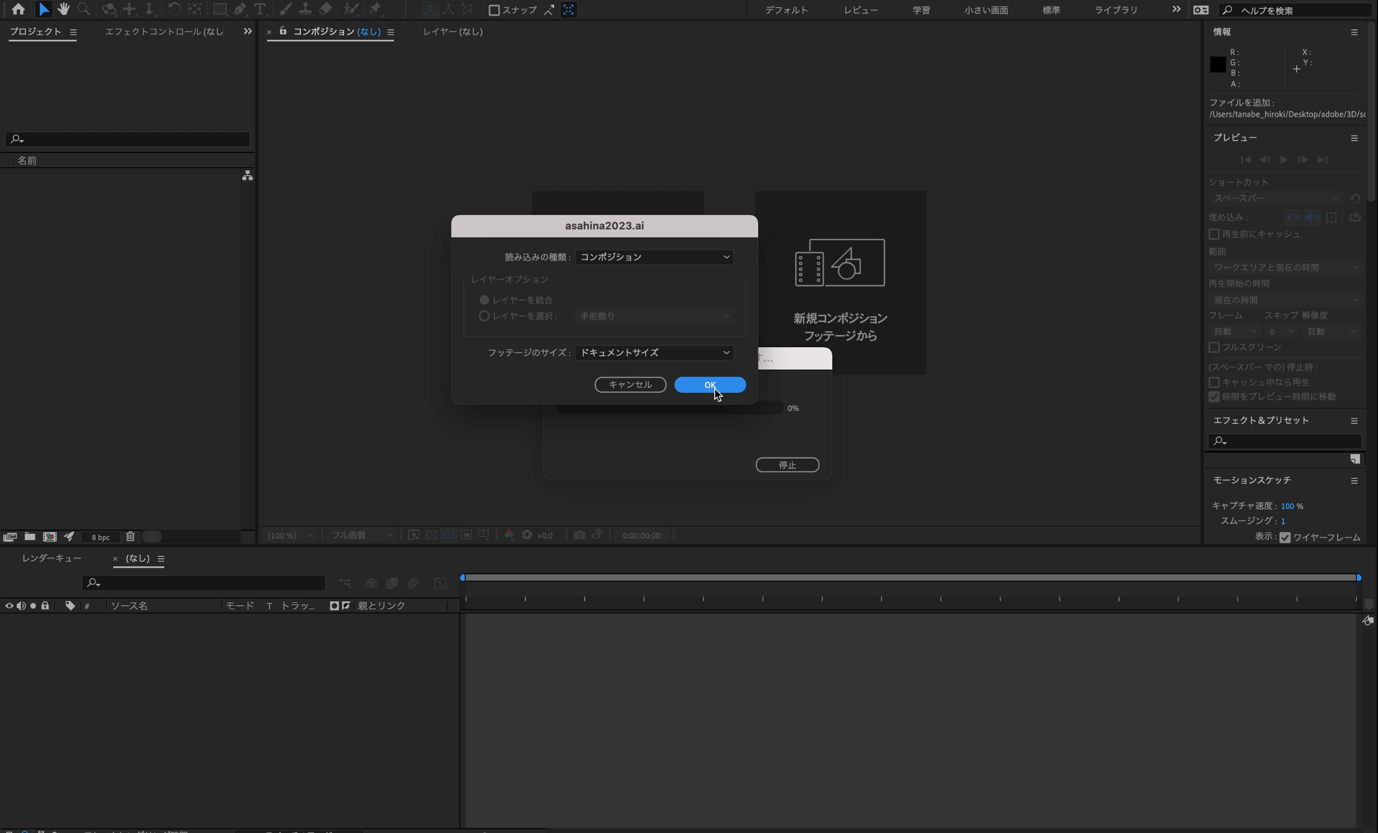 After Effectsを起動して素材を読み込み、新規コンポジションを作成します。