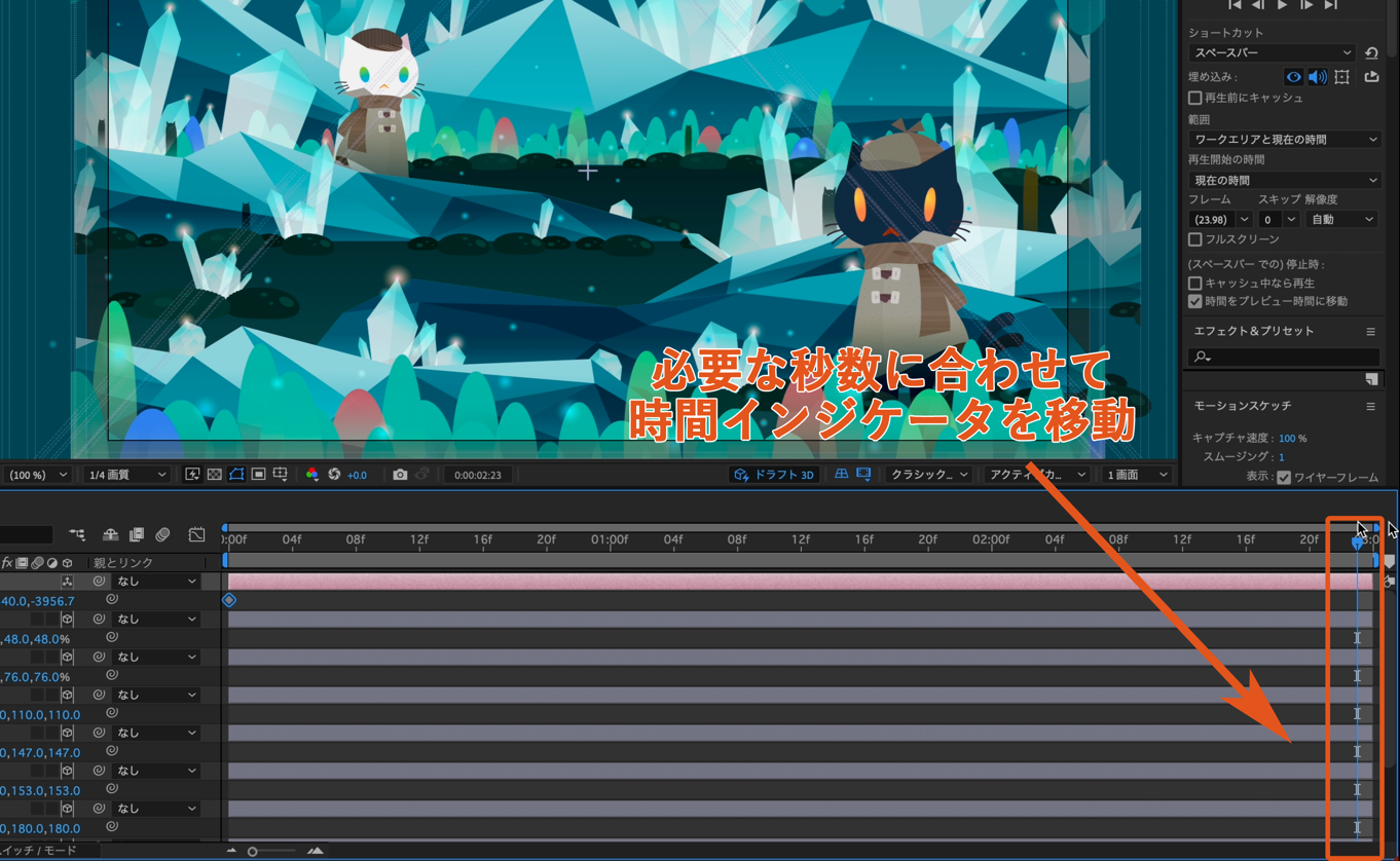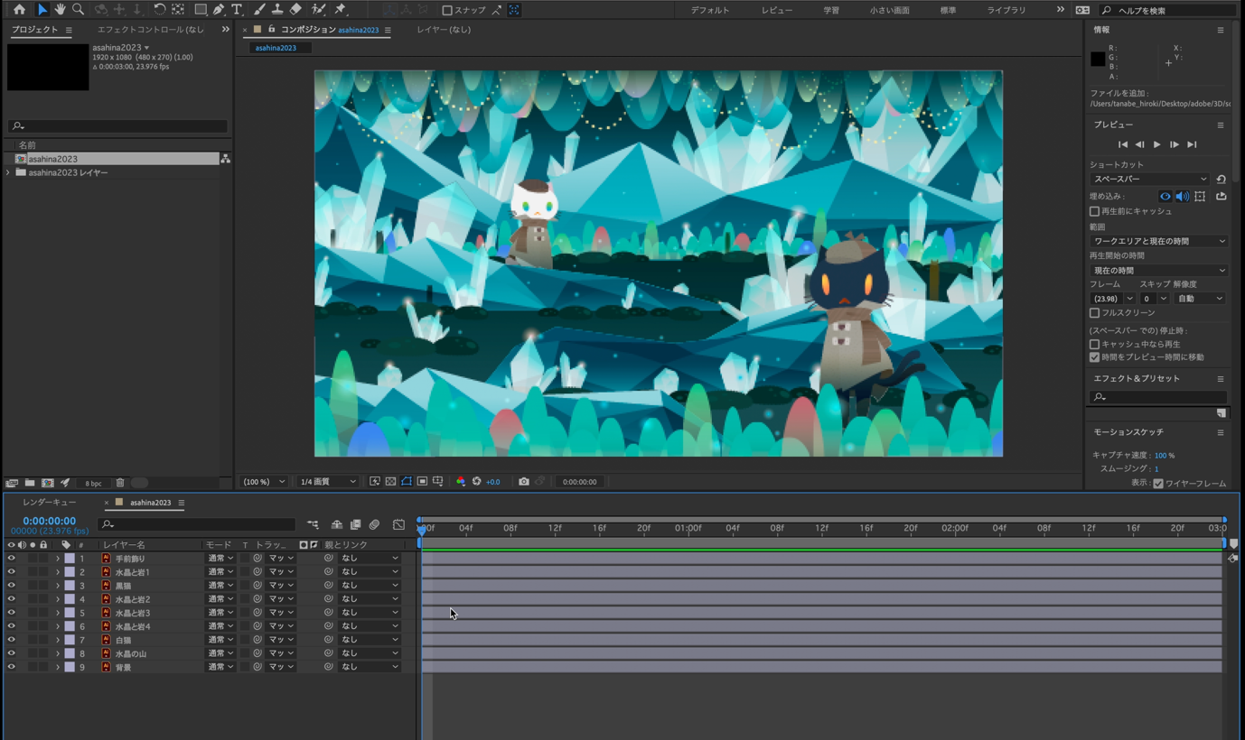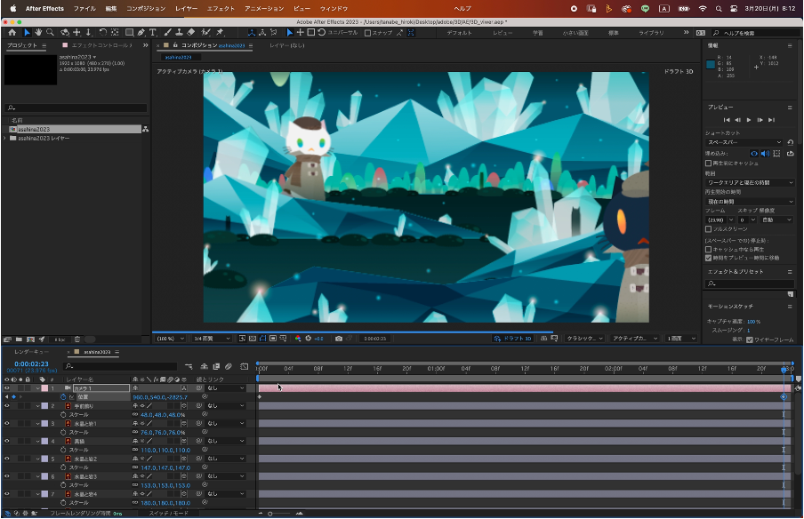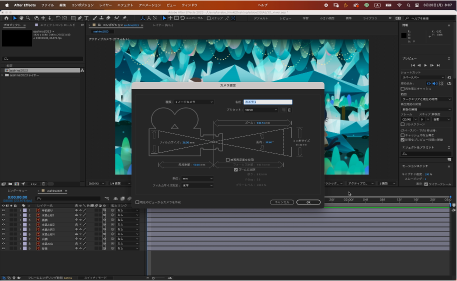 各レイヤーのサイズやZ軸の位置を調整が終わったらカメラレイヤーにアニメーションをつけていきます。