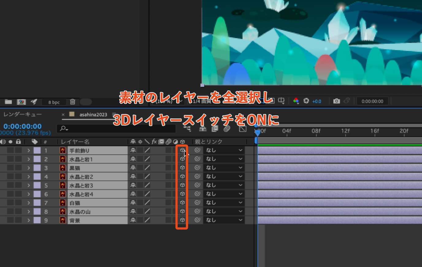 編集素材のレイヤーを全選択し、3Dレイヤースイッチをまとめてオンにします。