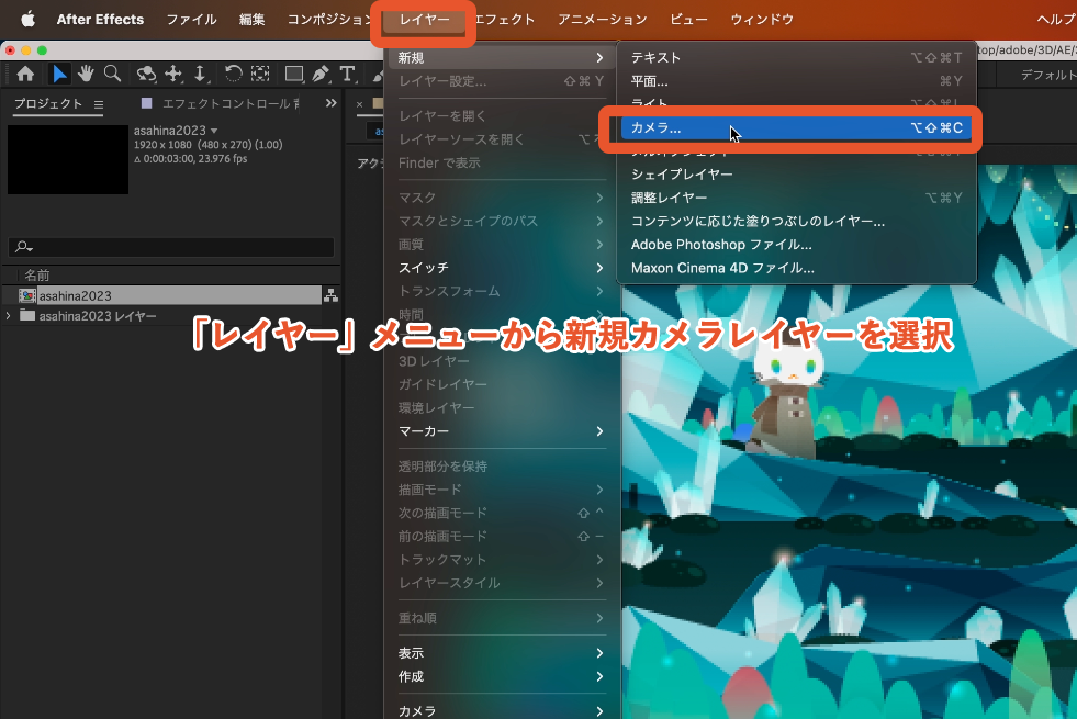 「レイヤー」メニューから「新規」→「カメラ」を選択し、カメラレイヤーを作成します。