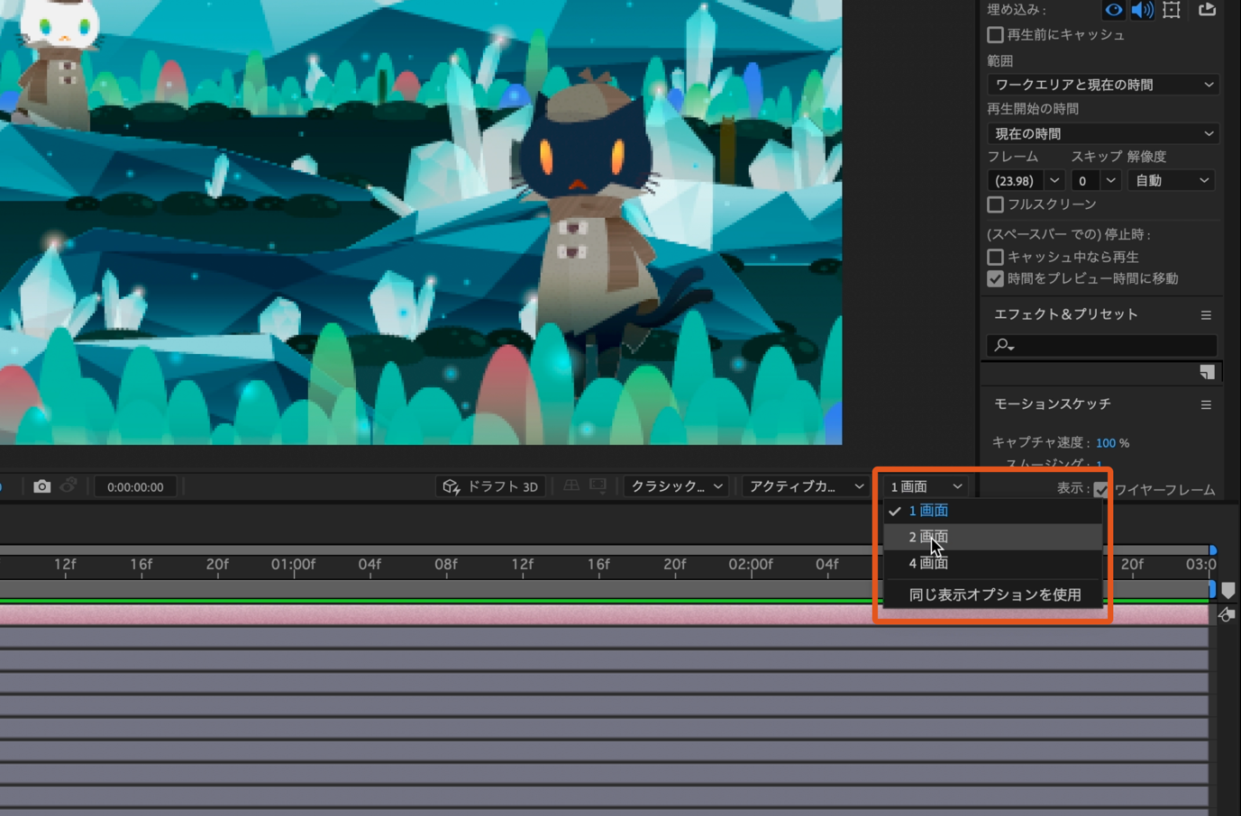 プレビューパネルで右下のプルダウンから画面を1画面から2画面に変更します。