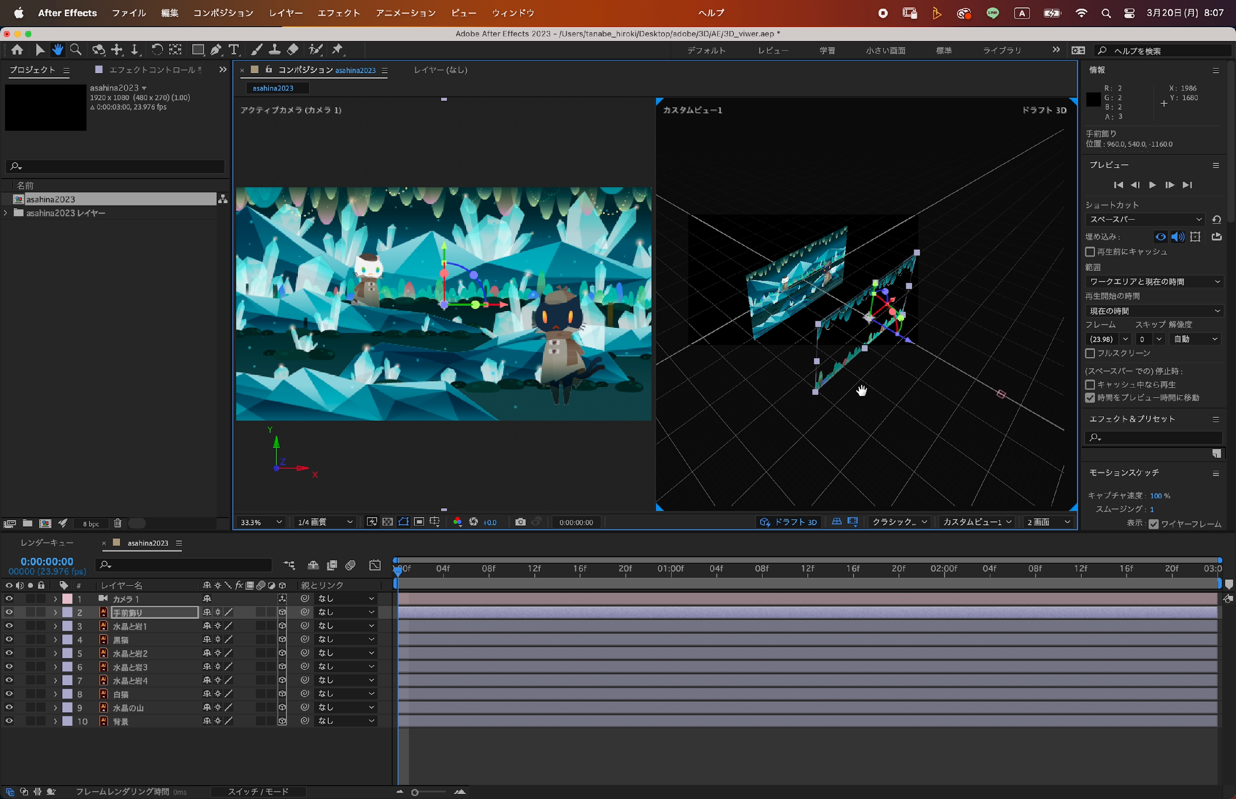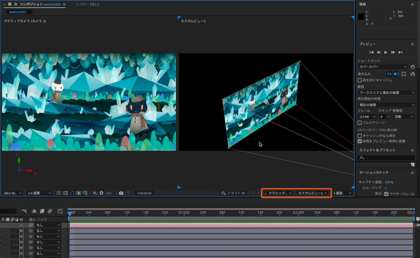 カスタムビューを見ながら各レイヤーにそれぞれ奥行きを感じさせるようにサイズやZ軸の位置を調整していきます。