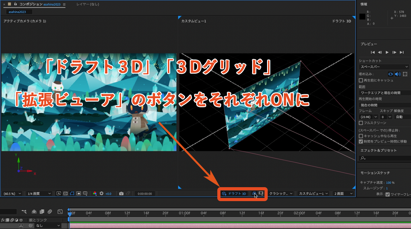 プレビューパネルで「ドラフト3D」ボタンと「3Dグリッド」ボタンをオンにし、「拡張ビューア」ボタンを有効にします。