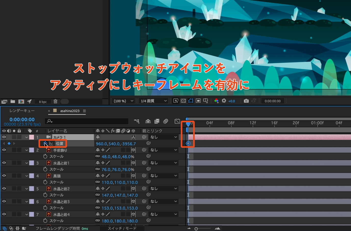 最初にカメラレイヤーの位置プロパティのストップウオッチアイコンをアクティブにし、キーフレームを有効にします。