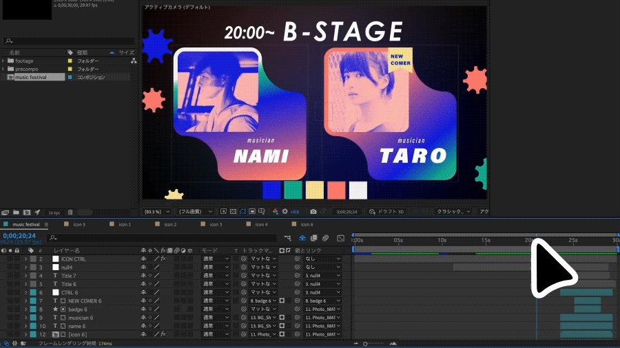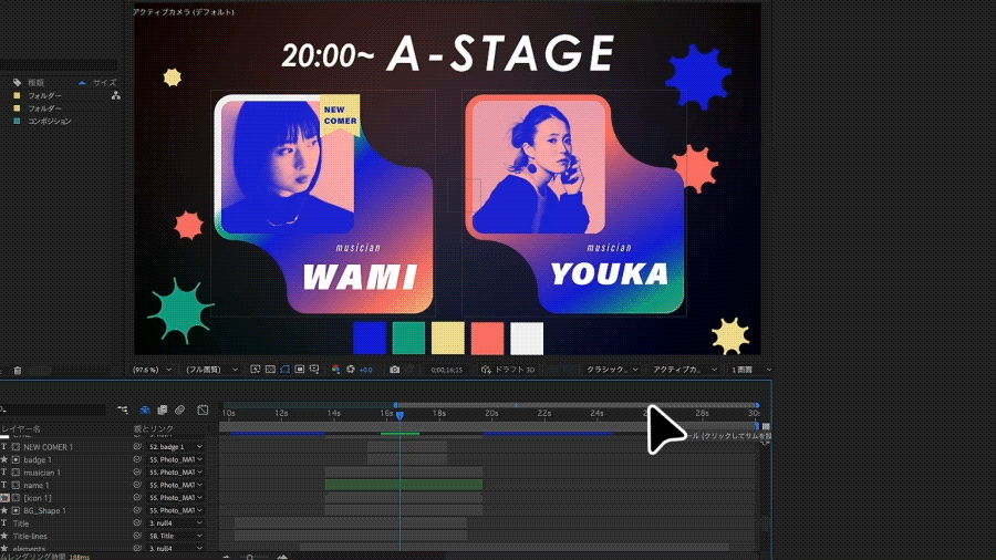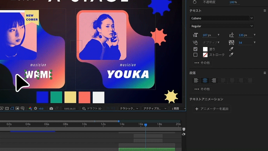 「namey」レイヤー(ラベル:グリーン、♯:54)を選択し、さらにバーをダブルクリックしてコンポジション画⾯上で⽂字を編集できる状態にします。