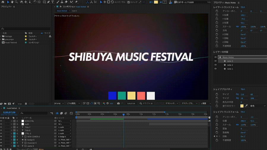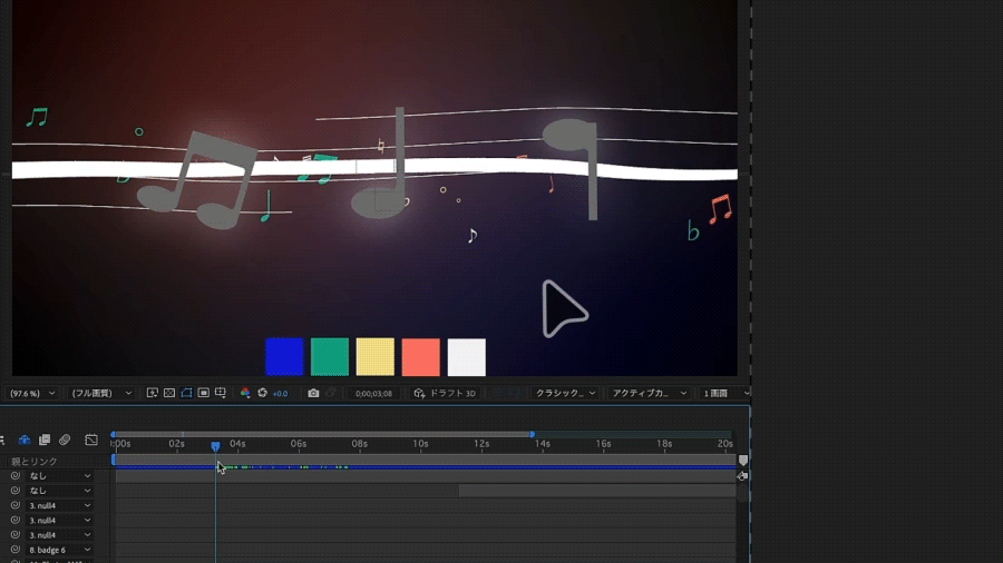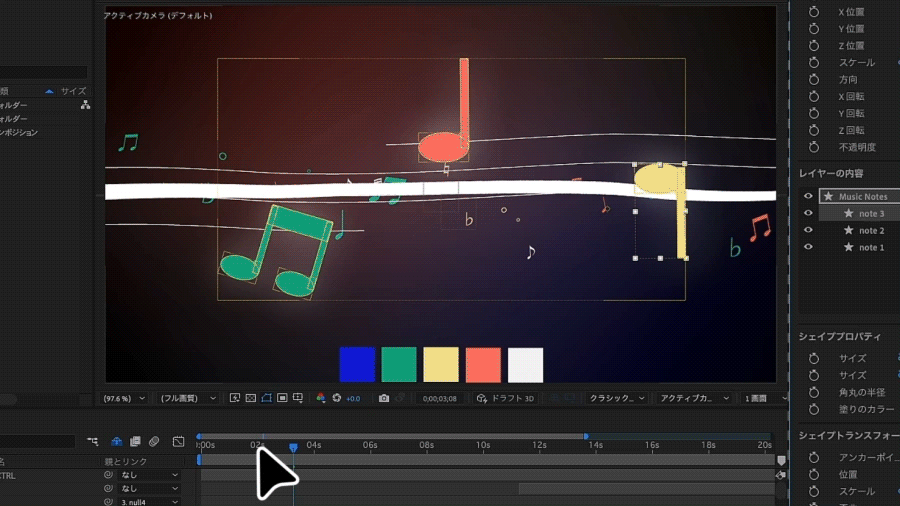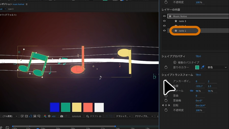 コンポジション画⾯上で、3つの⾳符のシェイプのいずれかをクリックして選択します。プロパティパネルの「レイヤーの内容」で「Music Notes」が表⽰されていることを確認し、その中の「note 3」を選択します。
