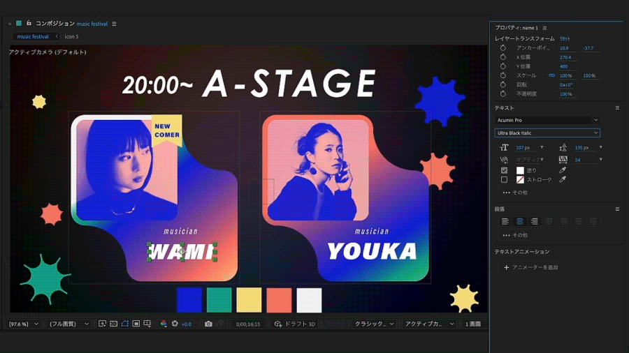 「WAMI」の⽂字を選択した状態で、プロパティパネルの「テキスト」でフォントを「Cubano」から「Acumin Pro」に変更します。