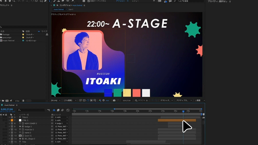 オブジェクトタイムラインパネルで、現在の時間インジケーターを「00:27:06」へ移動します。