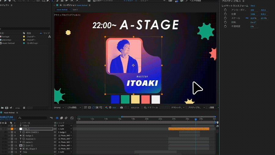 今度は⾳符のシェイプの位置を変更します。プロパティパネルでいずれかのレイヤーを選択し、「シェイプトランスフォーム」の「位置」の数値を変更します。ここでは、下記の数値に変更しています。