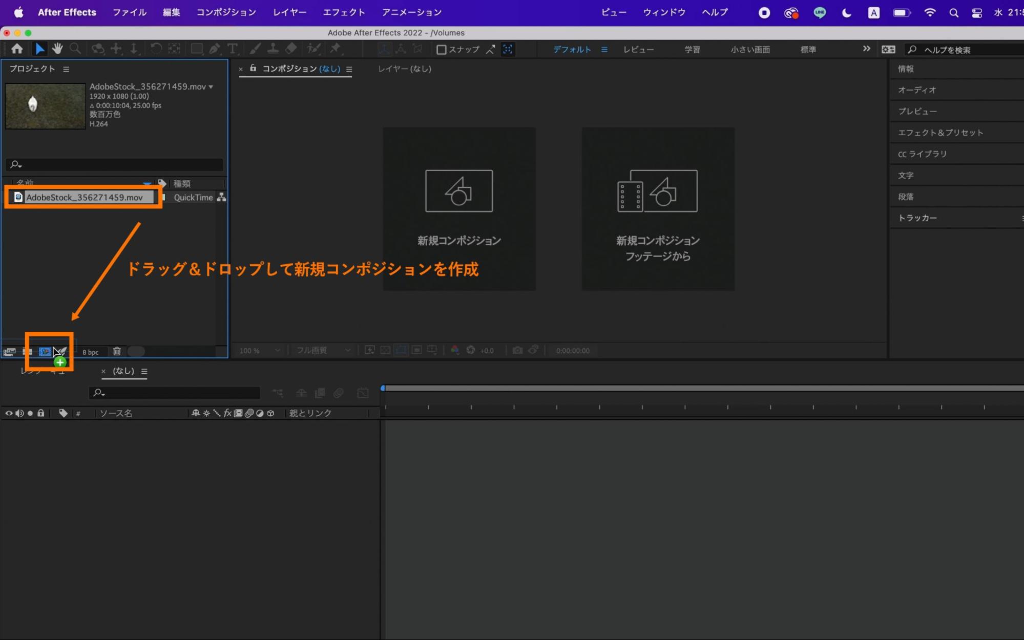 ドラッグ&ドロップで作成することで、解像度やフレームレートが素材と同じコンポジションを作成することが可能です。