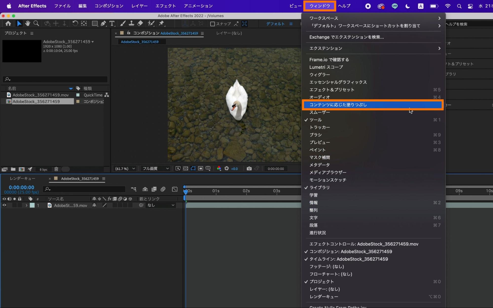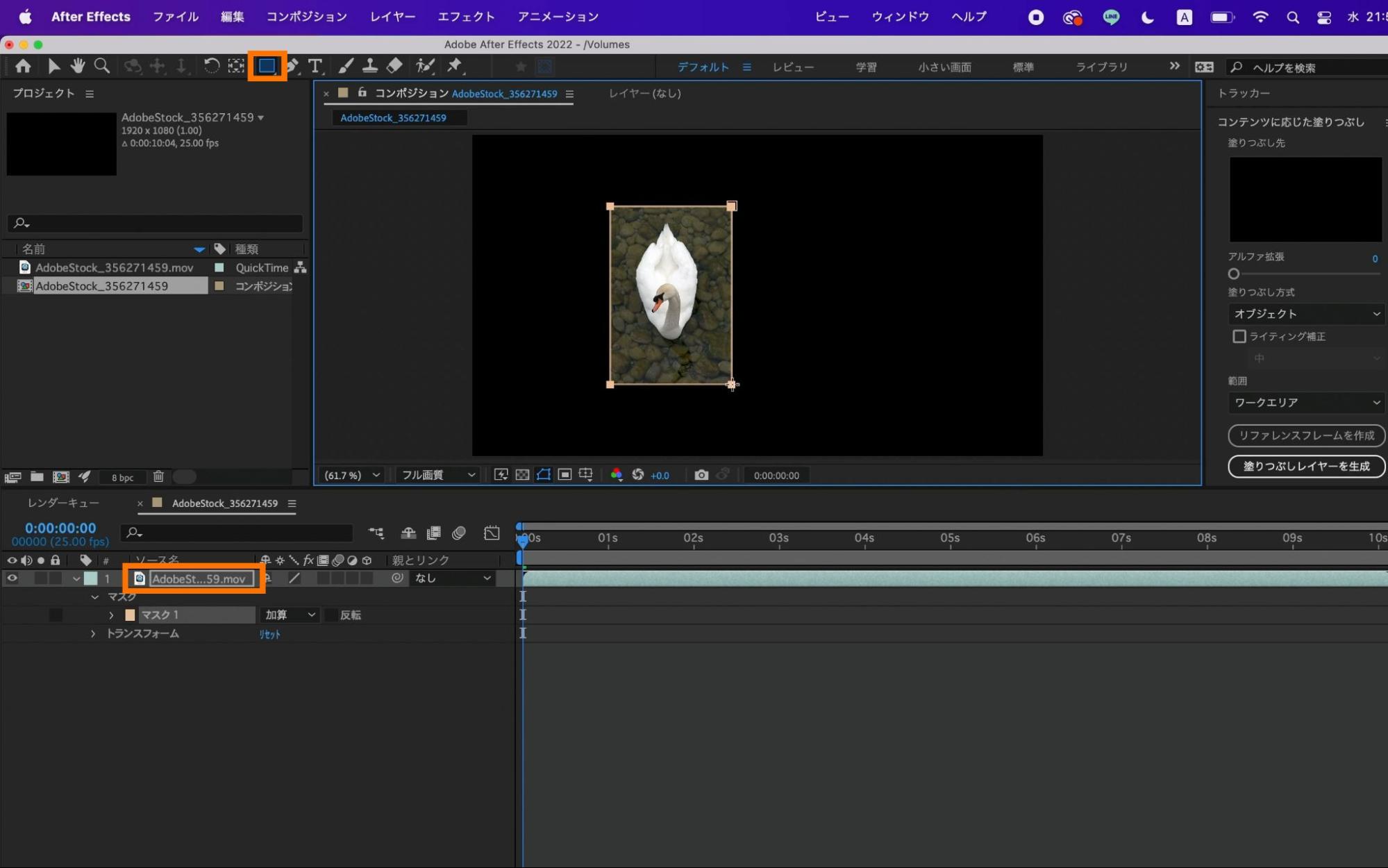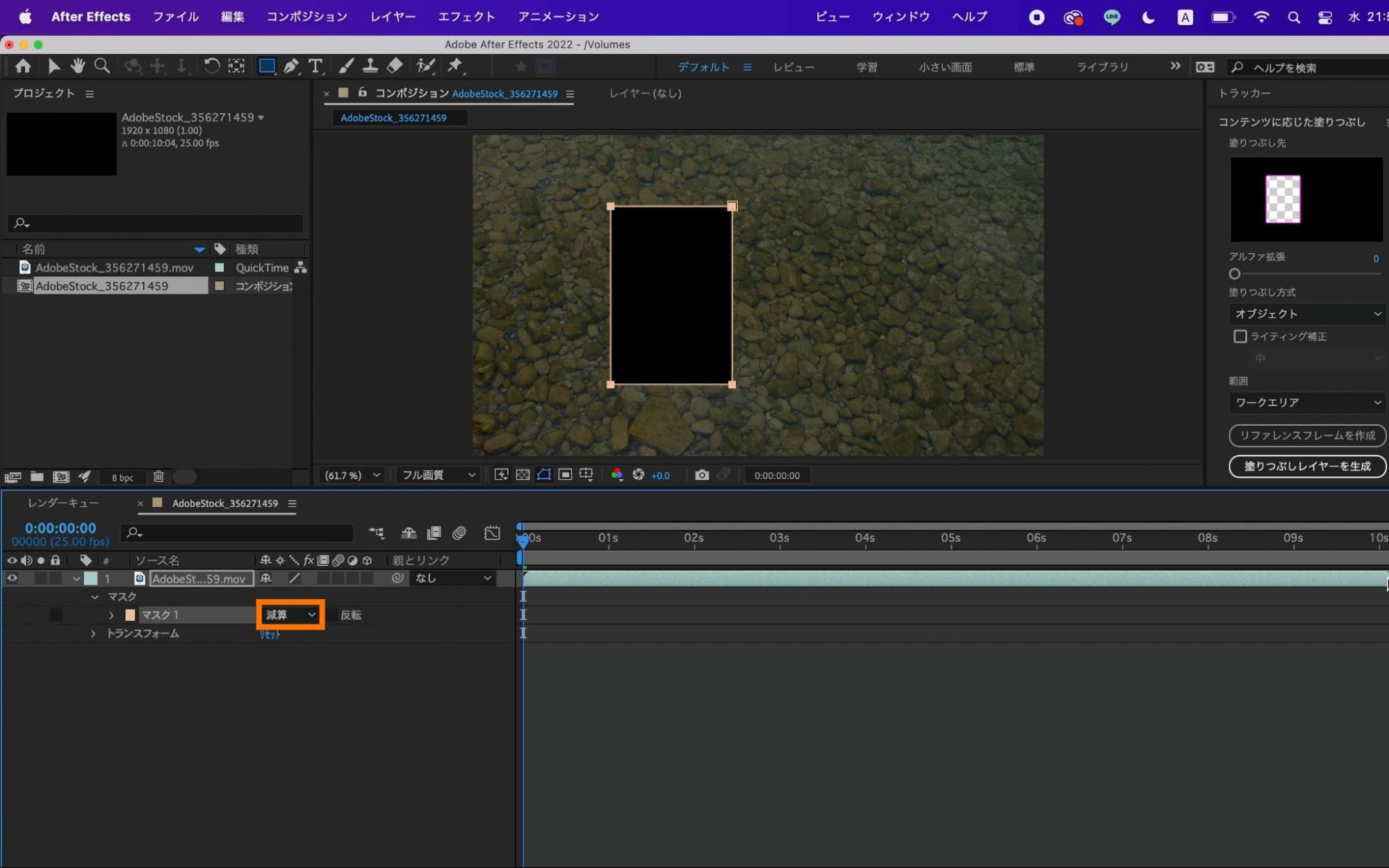 動画素材から不要な物を消すため「コンテンツに応じた塗りつぶし」機能を使用します。