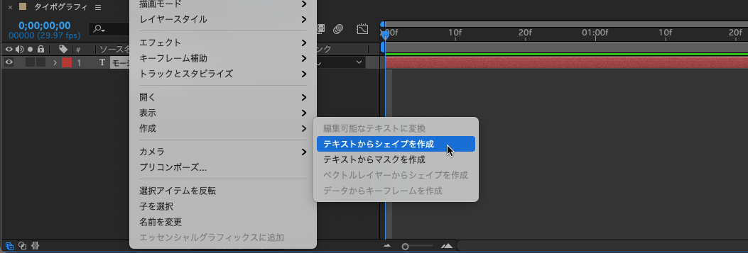 テキストレイヤーを選択して右クリックし、[作成]→[テキストからシェイプを作成]を選択します(シェイプレイヤーは頭に★マークが付きます)。