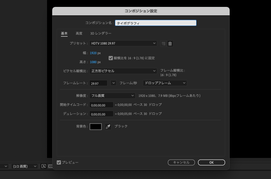 新しいプロジェクトを作成して、[コンポジションメニュー]→[新規コンポジションを作成]を選択します。「コンポジション設定」ウィンドウでは、「デュレーション」を5秒に設定し、背景色を黒にしておきます。