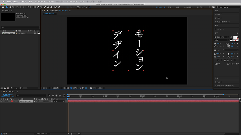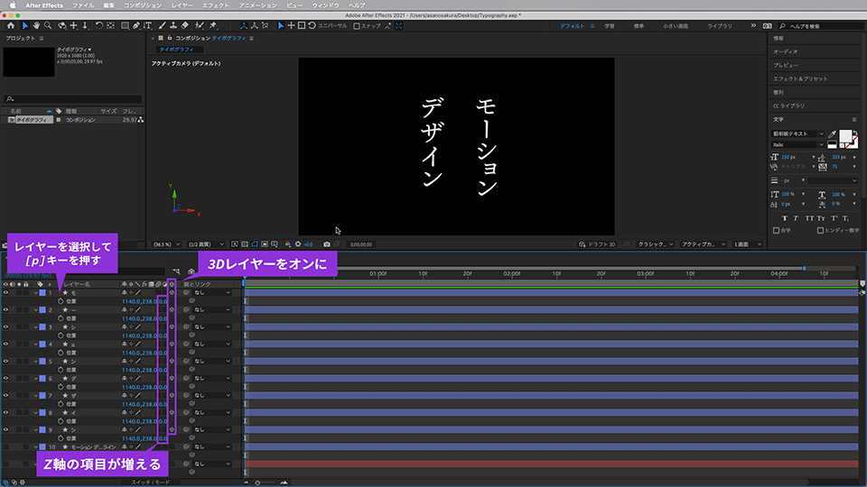 後述する「3Dレイヤー」を使うために、テキストレイヤーをシェイプに変換して、1文字ずつ個別のシェイプにします。