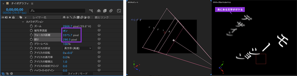 最後にカメラ自体の設定に調整を加えます。「カメラ1」レイヤーを選択して、「カメラオプション」を展開します。「被写界深度」の「オフ」のテキストをクリックして「オン」にします(このときストップウォッチのマークは押しません)。次に「フォーカス距離」「絞り」の数値を大きなものにします。すると、実際のカメラと同じようにボケが深くなります。