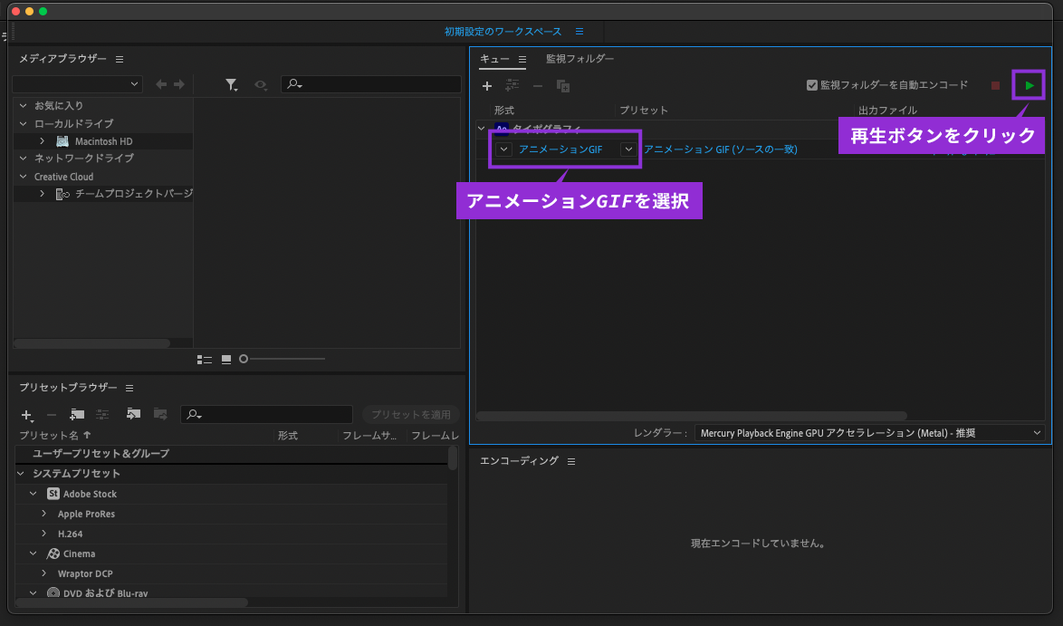 完成したら、[コンポジションメニュー]→[Adobe Media Encoder キューに追加…]を選択して、アニメーションGIF形式で書き出してみましょう。