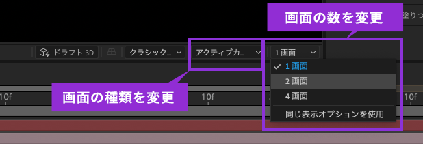 最後にコンポジションパネルの右下にある「1画面」とあるプルダウンを「2画面」にします。