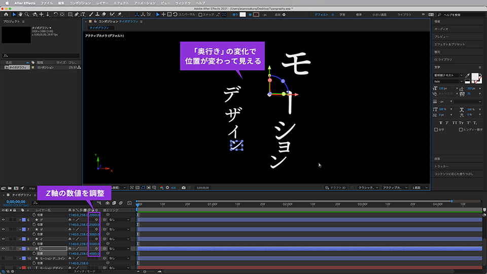 3Dレイヤーを使って文字に奥行きをもたせ、After Effectsの仮想のカメラが回転しながら奥に進んでいくデータを作成して、文字が連続して表示されるアニメーションを作ってみましょう。