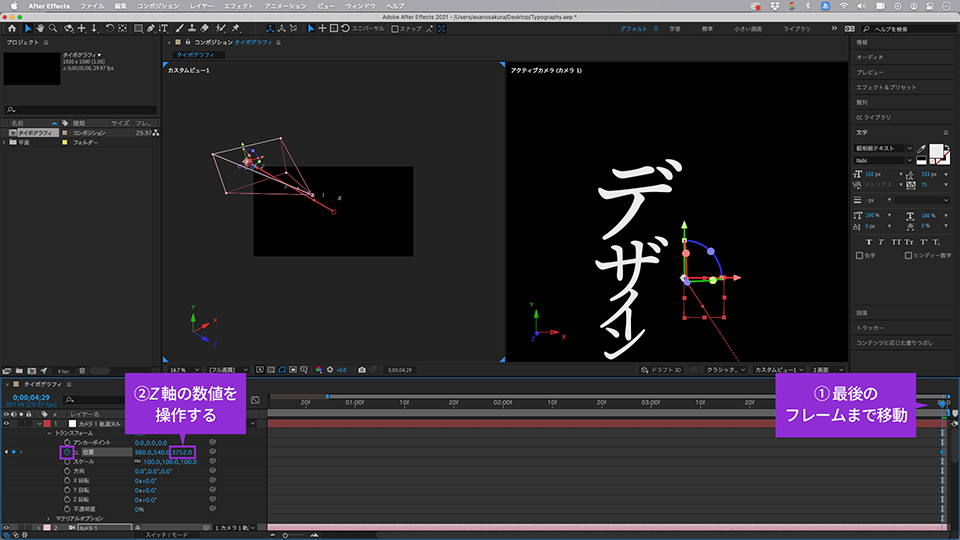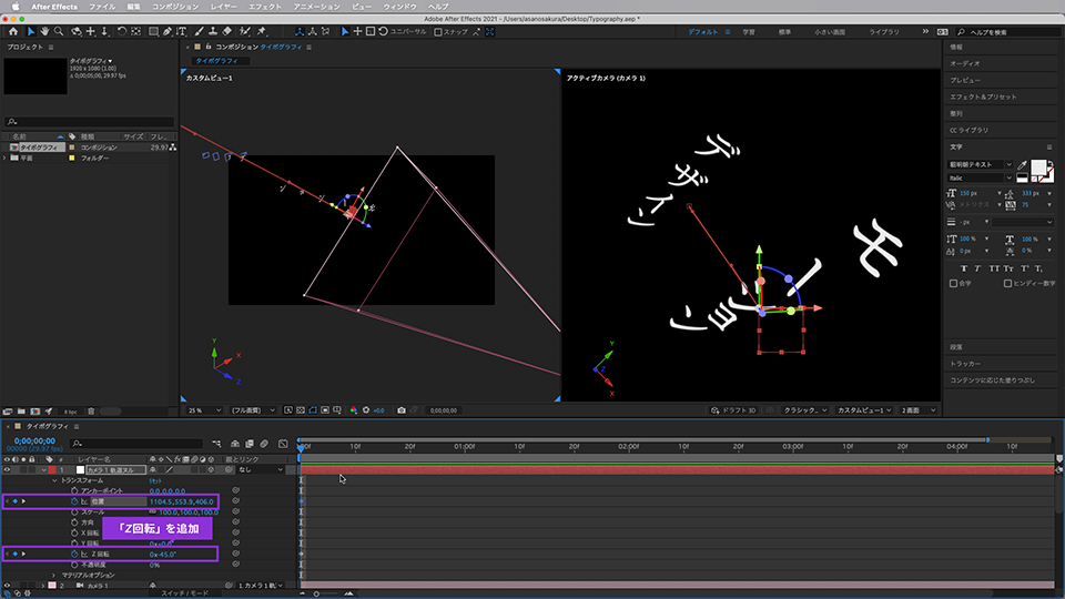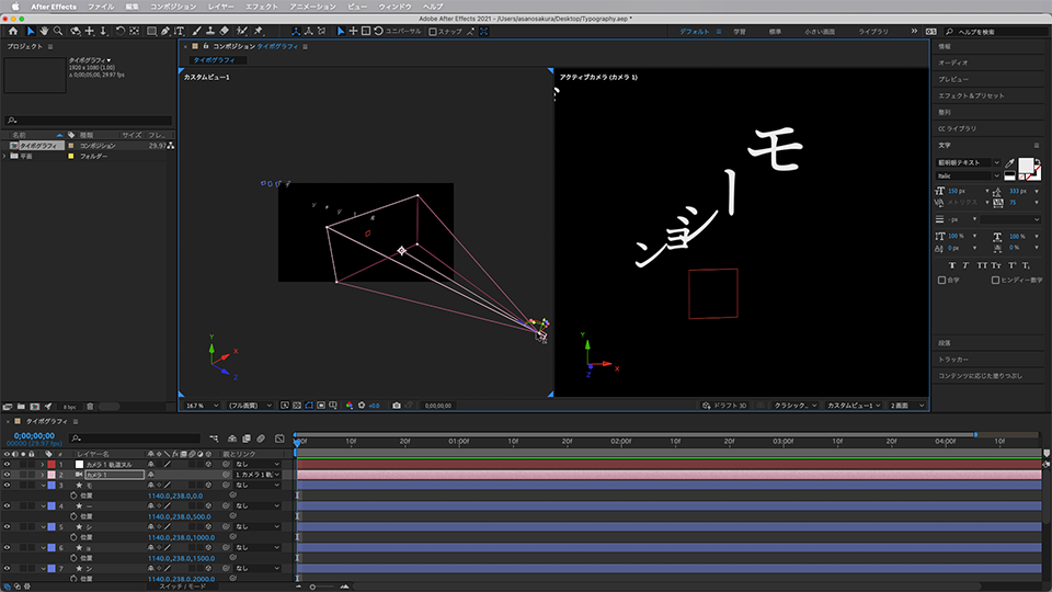 左右の画面をクリックして変更を有効にしたら、先程操作したプルダウンの左側にあるビューのプルダウンを操作して、左を「アクティブカメラ」に、右を「カスタムビュー1」にします。すると、左側が実際の見た目、右側が3D化したテキストレイヤーに対してどのようにカメラが配置されているかを示したものになります。