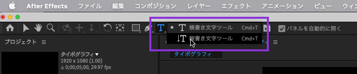 [横書き文字ツール]を長くクリックするとサブツールの[縦書き文字ツール]に切り替えられます。[縦書き文字ツール]を選択して、中央のコンポジションパネル内でクリックし、文字を入力してから[文字パネル]でフォントの種類や大きさ、色を設定します。