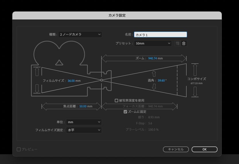 「カメラ設定」のウィンドウが表示されたら、種類:「2.ノードカメラ」のままにして[OK]を選択すると、レイヤーパネルの一番上にカメラレイヤーが作成できました。