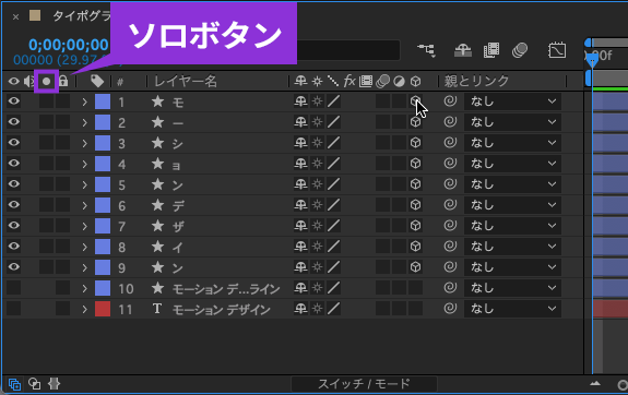 シェイプレイヤーに変換されたら、Command(Ctrl)+[D]キーでシェイプレイヤーをテキストの数だけ複製してから、1文字ずつ残してほかを削除し、1文字ずつのシェイプレイヤーを作成します。