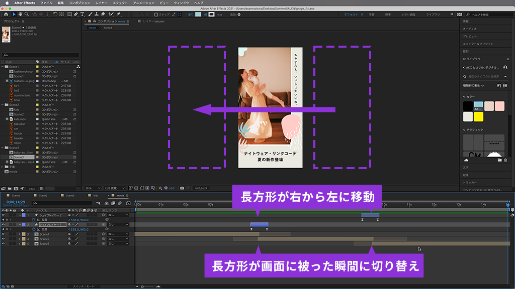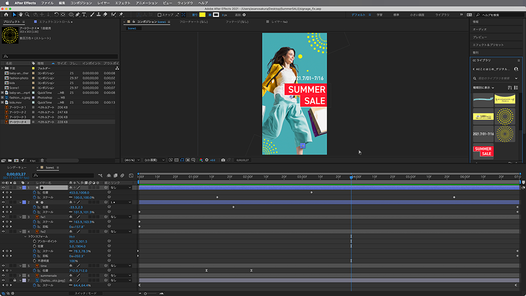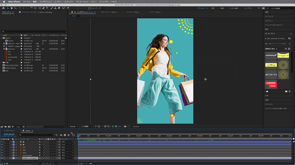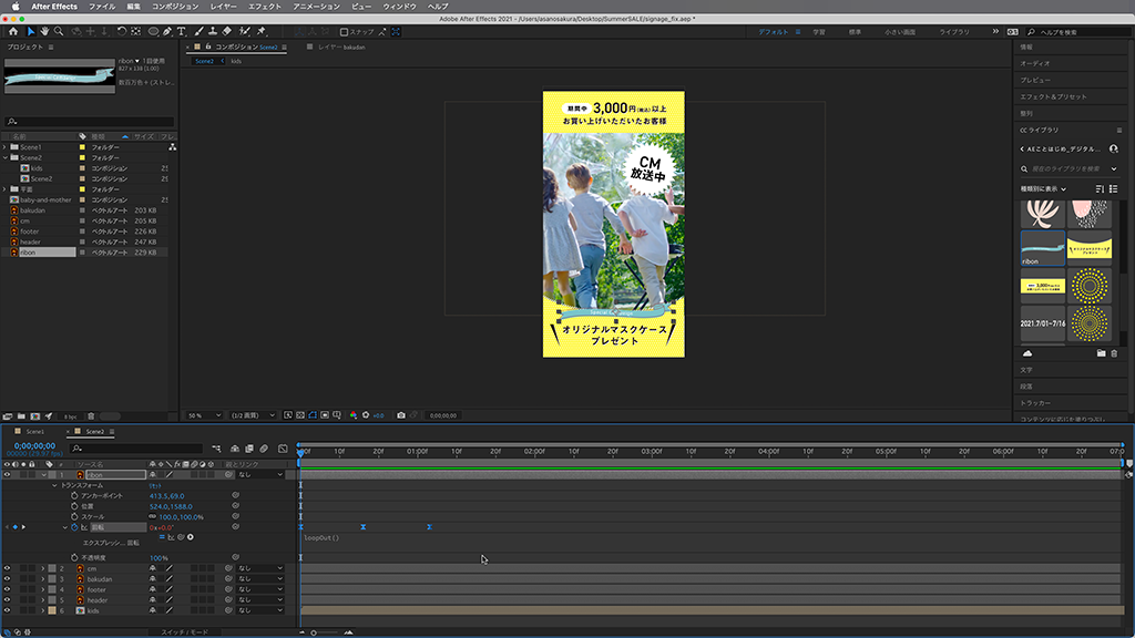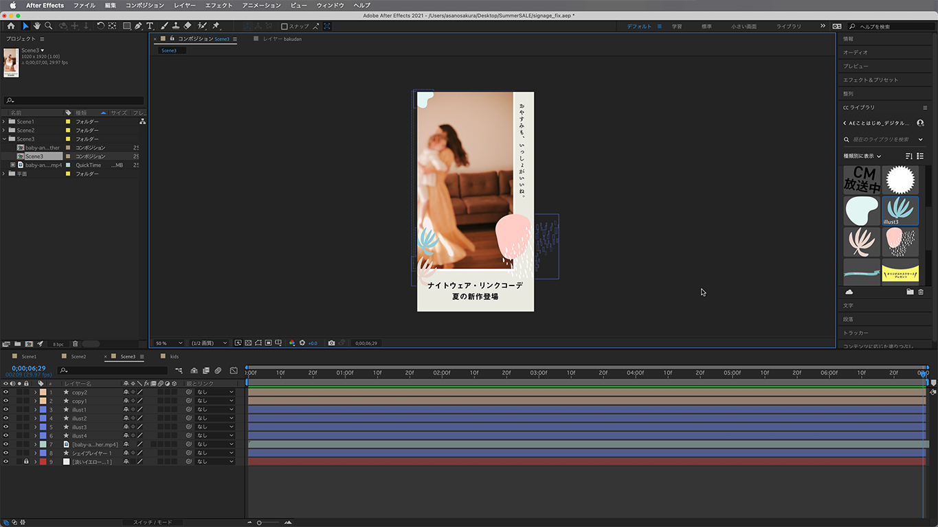 店頭などで目立つデジタルサイネージ用途のショートムービーを制作します。Illustratorで作成したデザインをCCライブラリを使ってAfter Effectsのプロジェクトに読み込み、動画やビットマップ画像を配置します。最後にシーン同士をつなげましょう。
