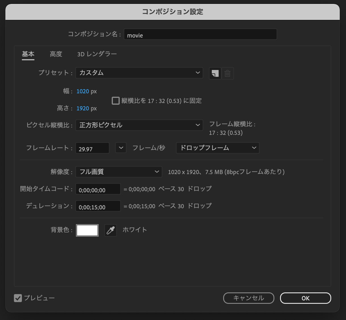 次に、1つめのシーン用のコンポジションを作ります。[コンポジションパネル]→[新規コンポジション]を選択して、1920px × 1080px(縦)の空のコンポジションを作成します。デュレーションは7秒程度に設定しておきます。作成したコンポジションの中に、先程作成したプロキシのコンポジション(画像や動画)をドラッグして配置します。
