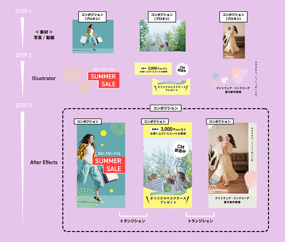 ①動画や写真といった実写の素材 ②Illustratorで作成したベクターデータ の2つを組み合わせて、複数のシーンを作っていきます。作成したシーンは最後にひとつのコンポジションにまとめて、シーン同士をつなげます(トランジションの作成)。