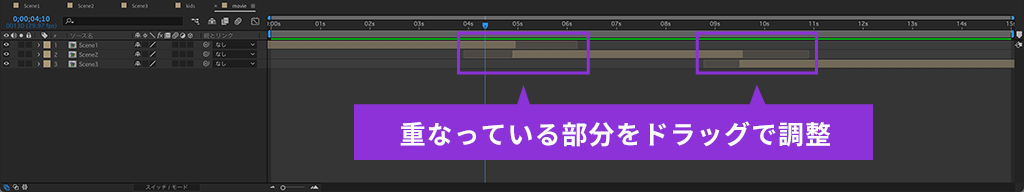 特に何もしない場合は、パッとシーン(コンポジション)が切り替わります。