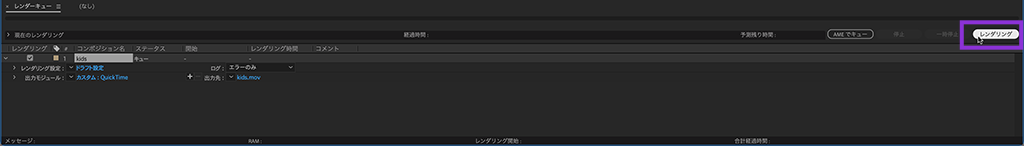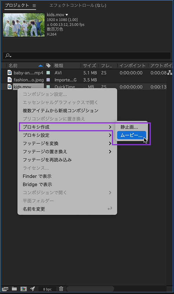 登録した動画のフッテージを右クリックして[プロキシ作成]→[ムービー]を選択します。ファイルの保存先を登録して、レンダーキューに動画が設定されたことを確認したら、右の[レンダリング]ボタンを選択します。