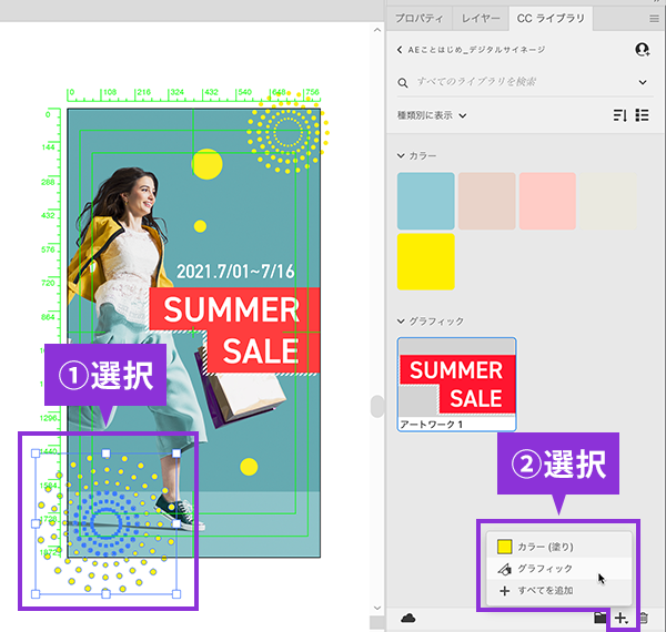 Illustratorで作成したデザインのうち、After Effectsで作るもの(シンプルな形や背景の色など)以外を「グラフィック」としてCCライブラリに登録します。