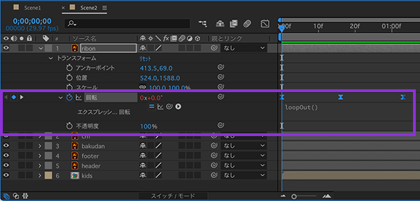 シーンの中で同じ動き(回転)を繰り返したい場合は、「回転」のテキストを選択しながら[Shiftキー]を押しながらクリックしてエクスプレッションの入力パネルに